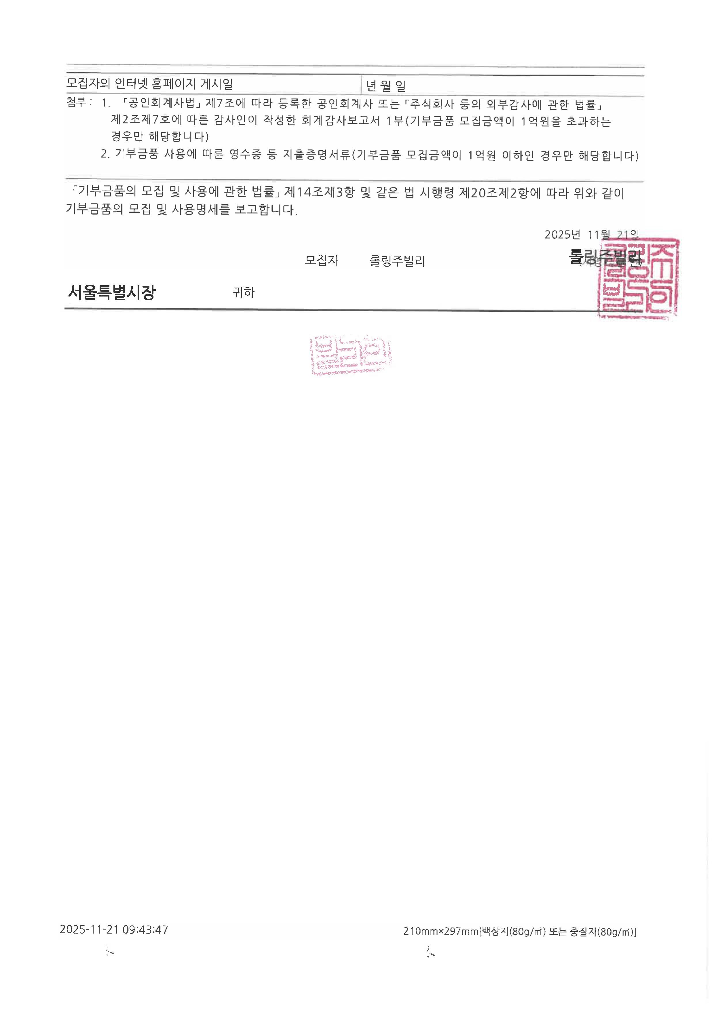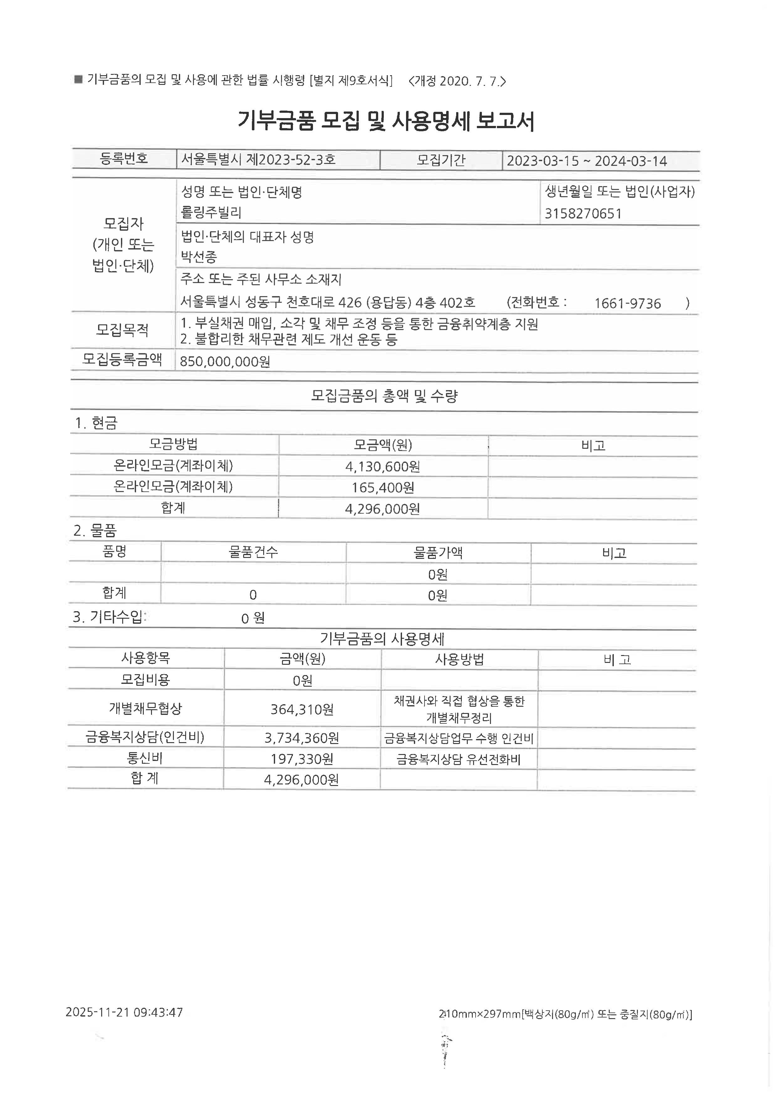 기부금품 모집 및 사용명세 보고서 (제2023-52-3호)
