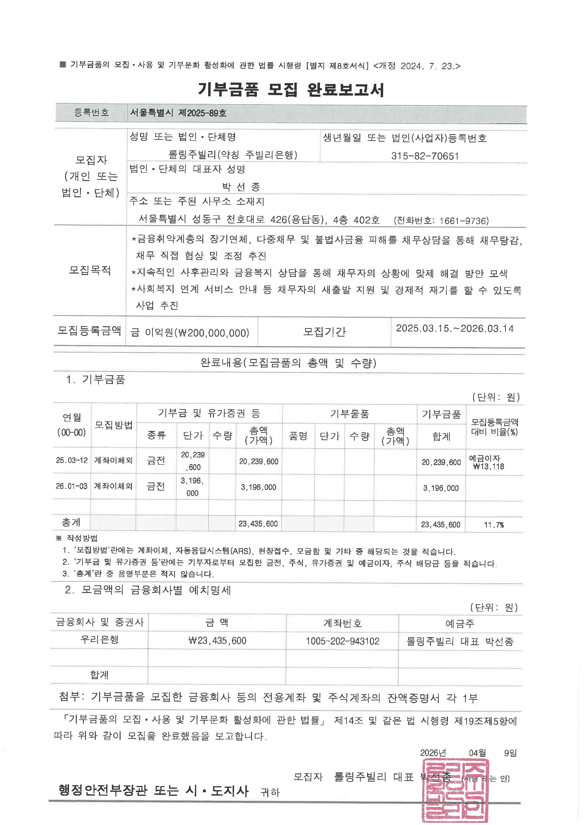 롤링주빌리는 "기부금품의 모집 및 사용에 관한 법률" 제 4조의 규정에 따라 기부금품 모집을 등록하였고(등록번호 서울특별시 제2025-89호), 모집 등록 기간이 완료되어 완료 보고서를 주무관청인 서울시에 제출하였습니다. 해당 기간 동안 모금 총액  ₩23,435,600이 모집되었습니다. (이자 ₩13,118 별도)